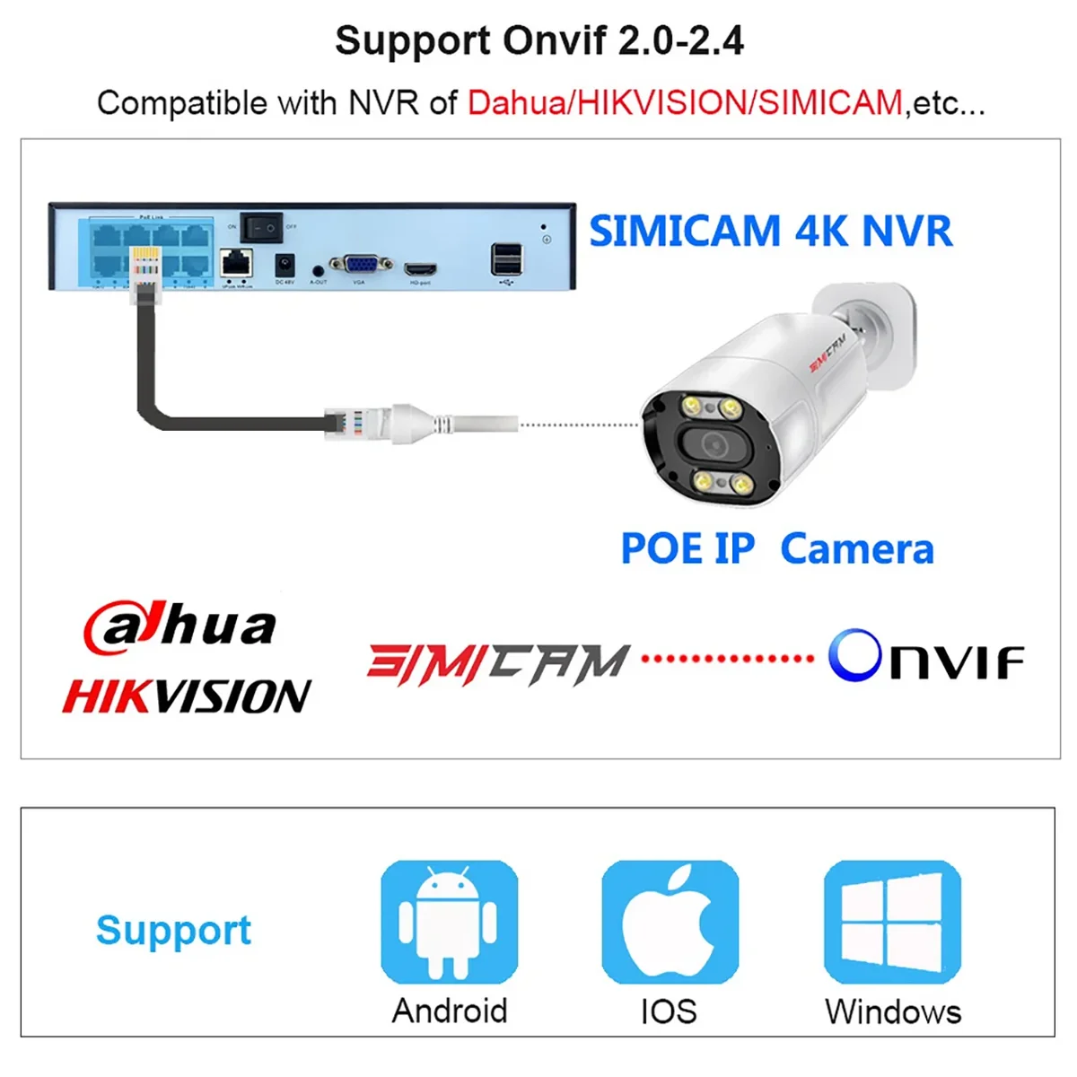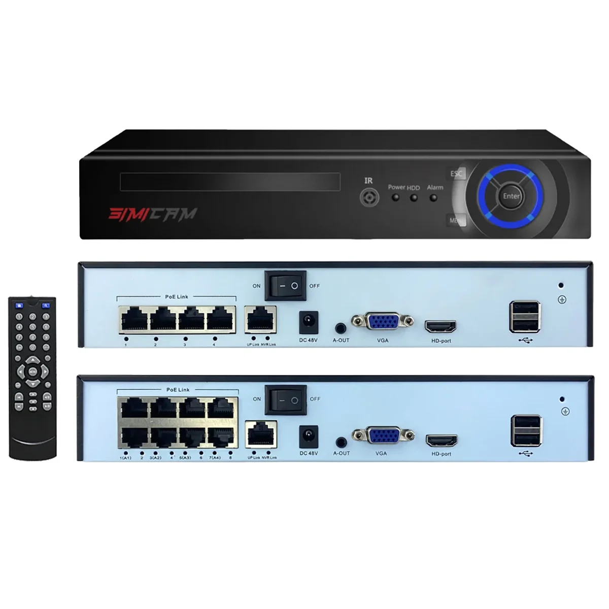 Simicam N8X08FE – це 8 або 4-канальний POE відеореєстратор NVR з підтримкою ONVIF для POE-камер до 8MP. Він має роздільну здатність запису 3840×2160, підтримує формат стиснення H.265, а також оснащений HDMI та VGA відеовиходами. Пристрій працює на операційній системі Linux і підтримує жорсткі диски до 8 ТБ.